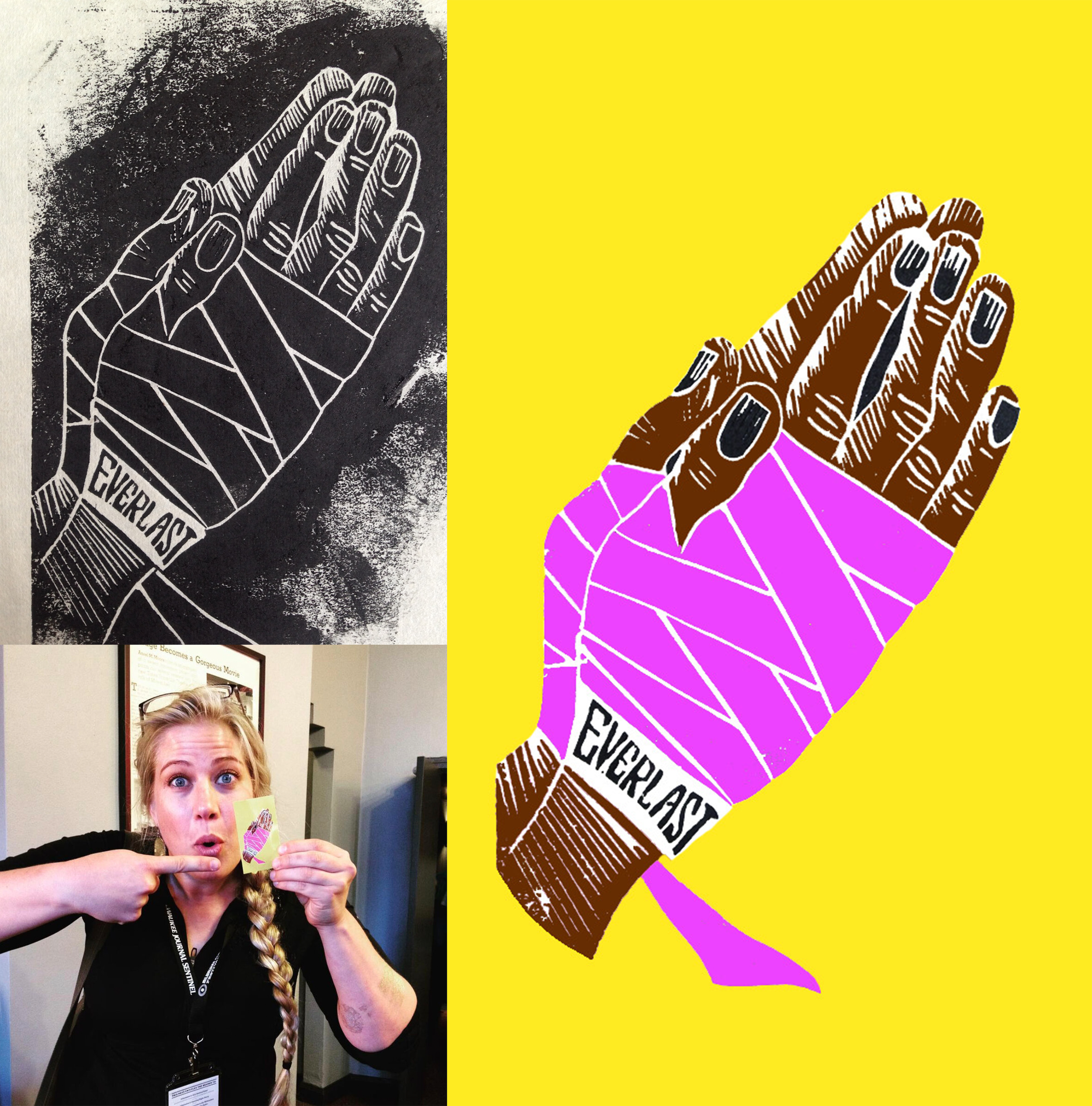 I designed a sticker based on the film “Boxeadora”. The film Boxeadora follows Namibia, a Cuban woman who has been training in secret as a boxer for five years, hoping the government would lift its ban. Now 38, she only has two years left of boxing eligibility. Journey with Namibia as she tries to leave the island to follow her only dream: to compete as a boxer. My process was to carve and print an image and then manipulate it digitally. My sticker was distributed to film goers after they watched Boxeadora. I love the Milwaukee Film Festival and attend it every year. You can check it out here: mkefilm.org. I also got to meet Meg Smaker, the filmmaker behind Boxeadora, and she was very excited about the design. The sticker was also used by MKE Film for promotions and giveaways.